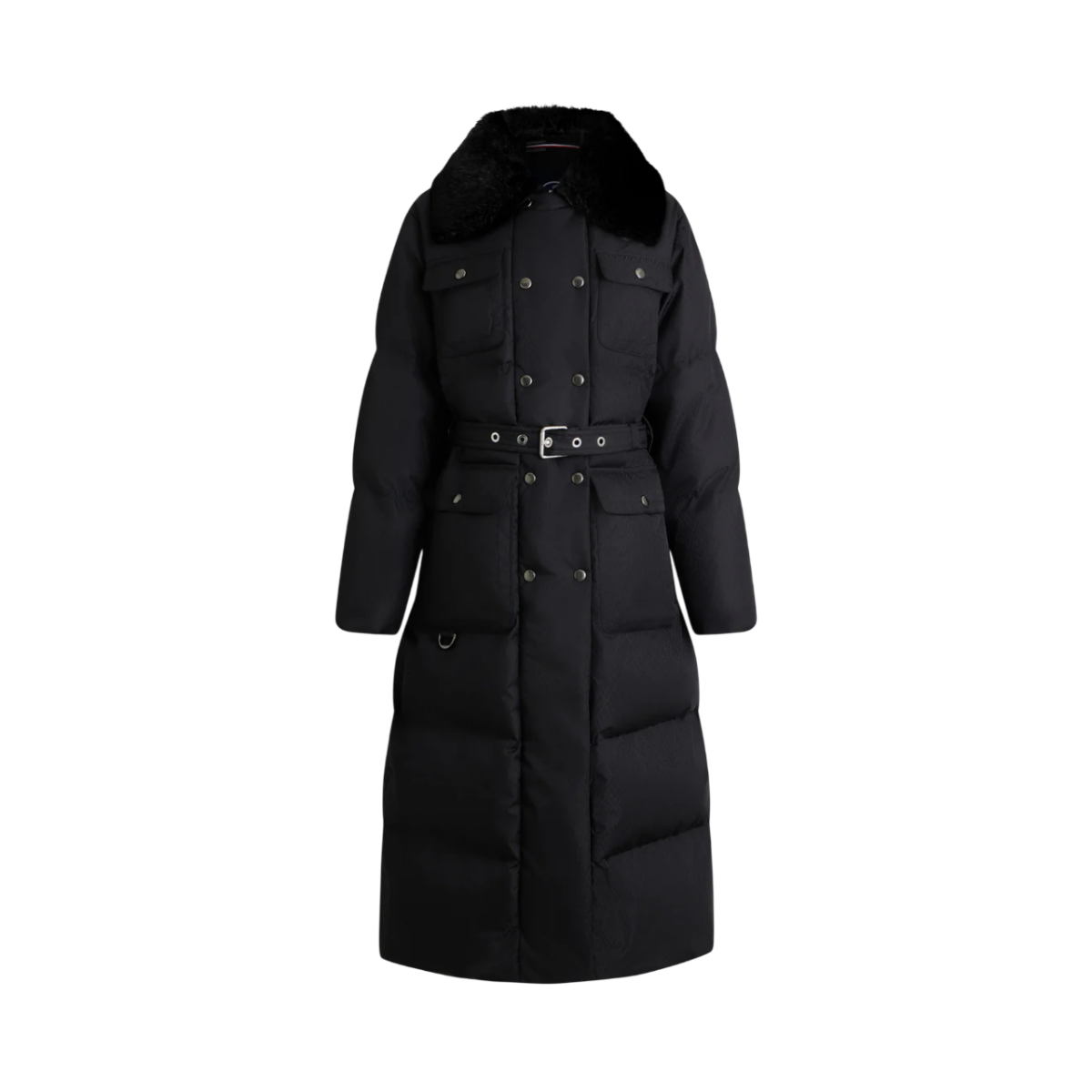 Le col amovible en fausse fourrure apporte une touche luxueuse et modulable, tandis que la ceinture amovible structure la silhouette pour un rendu féminin et élégant. Pratique et fonctionnel, le modèle intègre plusieurs poches, dont des poches zippées discrètes, ainsi que des finitions brillantes qui soulignent le style affirmé de la pièce.